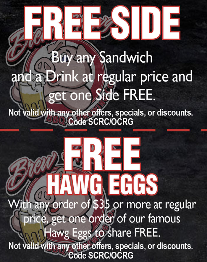 Brew Hawg 665 N. Tustin St, Suite J Orange CA 92867 Call for Reservations/Ordering 714-502-4053 Visit our Website ORDER BREW HAWG ONLINE Just show your coupon to your server and $AVE!