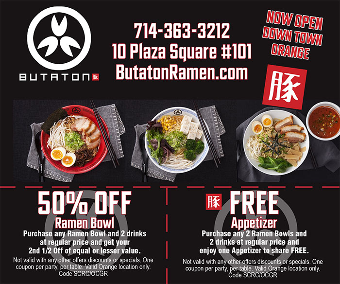Butaton Ramen 10 Plaza Square #101, Orange Call for Reservations/Ordering (714) 363-3212 Go to our Website Just show your coupon to your server and $AVE!
