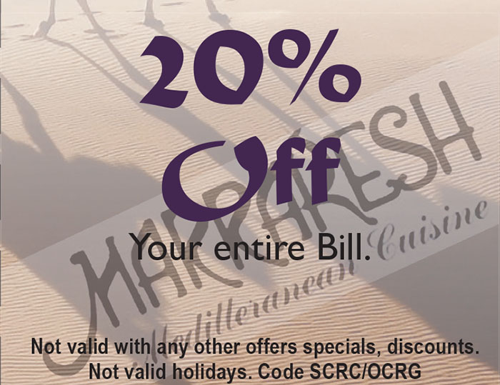 Marrakesh 1976 Newport Blvd Costa Mesa Call for Reservations/Ordering (949) 645-8384 Visit our Website Just show your coupon to your server and $AVE!