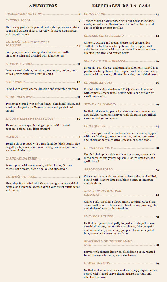 Matador Menu