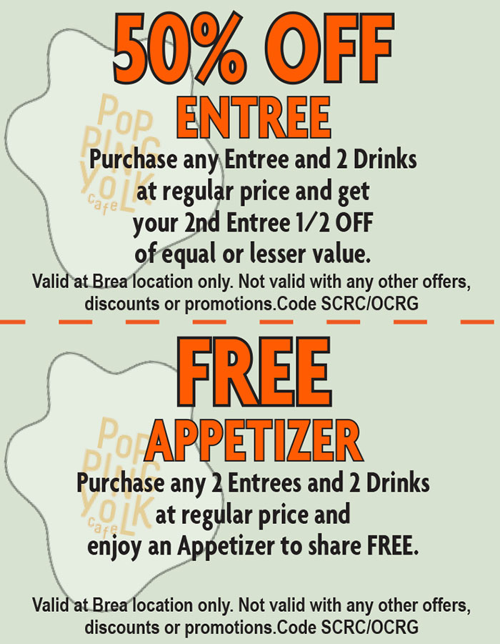 1160 E. Imperial Hwy, BreaCall for Reservations/OrderingClick to call (714)748-6081 Visit our Website ORDER POPPING YOLK ONLINE Just show your coupon to your server and $AVE!