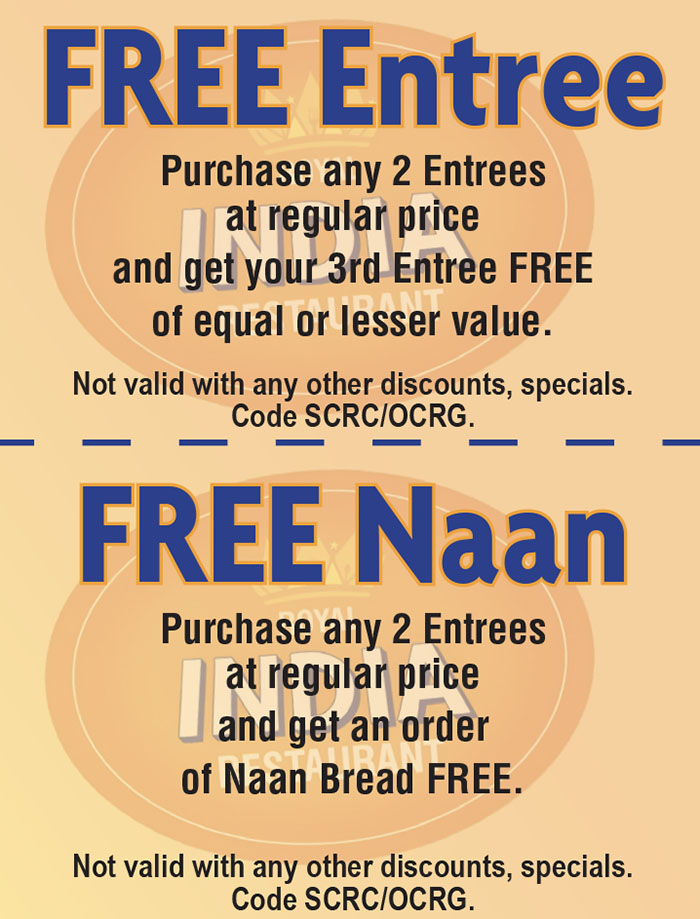 24288 Swartz Dr, IrvineCall for Reservations/OrderingClick to call (949) 454-9600Go to our Website ORDER ROYAL INDIA ONLINE Just show your coupon to your server and $AVE!