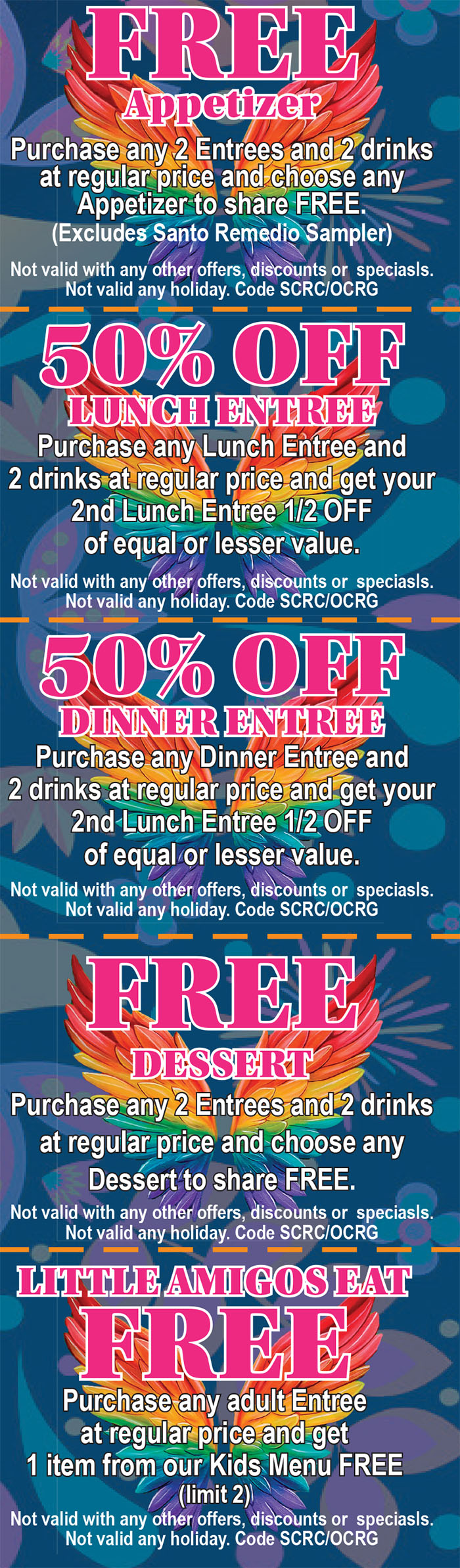 Santo Remedio Mexican Resto-Bar 720 E. Katella Ave, Orange Call for Reservations/Ordering (714) 941-6100 Go to our Website RESERVATIONS Just show your coupon to your server and $AVE!