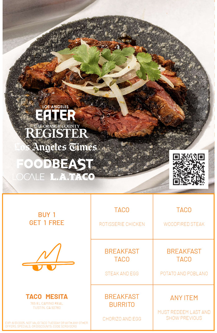 Taco Mesita 765 El Camino Real, Tustin Call for Reservations/Ordering (657) 293-4166 Go to our Website ORDER TACO MESITA ONLINE Just show your coupon to your server and $AVE!