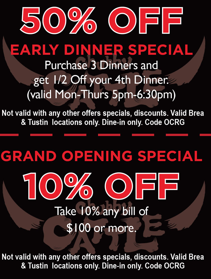 BreaCall for Reservations/OrderingClick to call (657) 286-7017120 S. Brea Blvd. TustinCall for Reservations/OrderingClick to call (657) 837-080223653 El Toro Rd Go to our Website Just show your coupon to your server and $AVE!