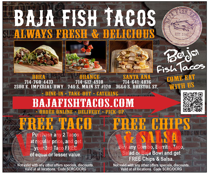 Baja Fish Tacos Brea (714) 760-4433 2500 E. Imperial Hwy Orange (714) 617-4910 745 S. Main St #170 Santa Ana (714) 641-4836 3664 S. Bristol St. Visit our Website ORDER BAJA FISH TACOS ONLINE Just show your coupon to your server and $AVE!