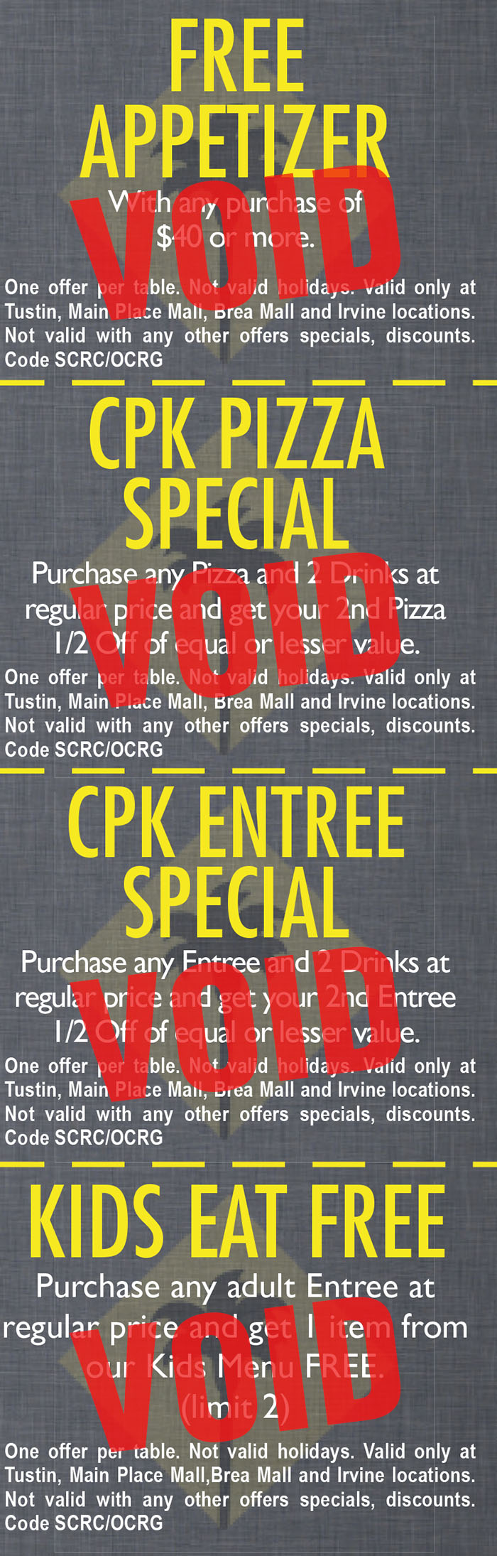 California Pizza Kitchen Brea Mall 1065 Brea Mall, Sp 2052A 714-672-0407 Tustin 3001 El Camino Real 714-838-5083 Mainplace Mall Santa Ana 2800 N. Main Street, #872 714-479-0604 Irvine Spectrum 5465 Alton Parkway 949-396-1120 Visit our Website ORDER CPK ONLINE Just show your coupon to your server and $AVE!