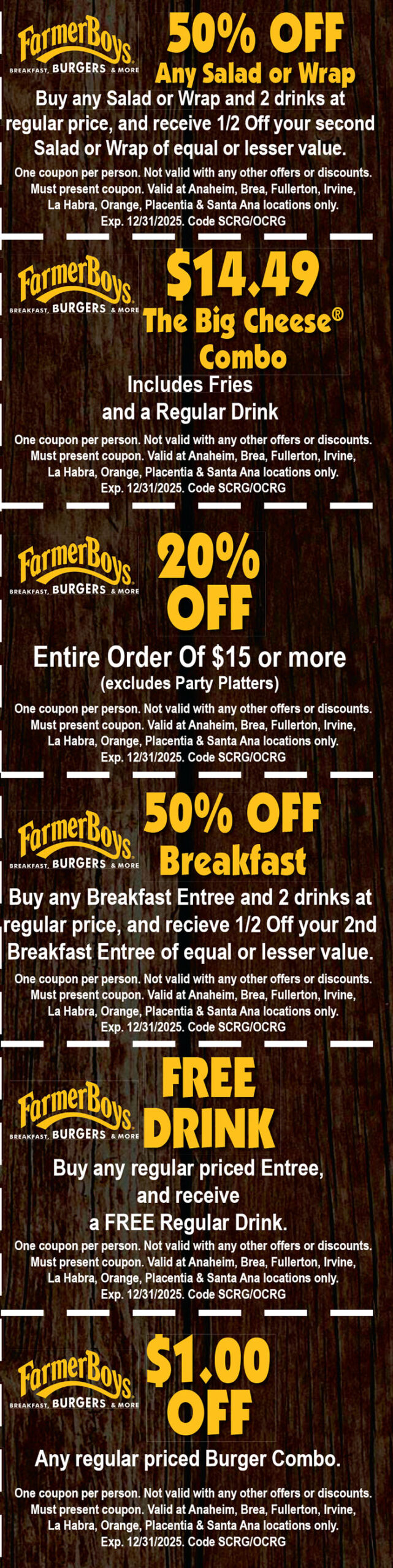 Farmer Boys Order Anaheim 4150 E. La Palma Ave Call for Reservations/Ordering 714.993.0990 Order Fullerton Harbor Blvd 1446 N. Harbor Blvd Call for Reservations/Ordering 714.578.5000 Order Fullerton Placentia Ave 662 S. Placentia Ave Call for Reservations/Ordering 657.217.2973 Order Brea 500 W. Lambert Rd Call for Reservations/Ordering 714.990.2424 Order Irvine 17380 Redhill Ave Call for Reservations/Ordering 949.407.7404 Order La Habra 602 S. Harbor Blvd. Call for Reservations/Ordering 714.315.8757 Order Orange 1220 N. Batavia St. Call for Reservations/Ordering 714.771.2343 Order Santa Ana 2205 E. 17th St. Call for Reservations/Ordering 714.954.0750 Visit our Website Get Our App Just show your coupon to your server and $AVE!
