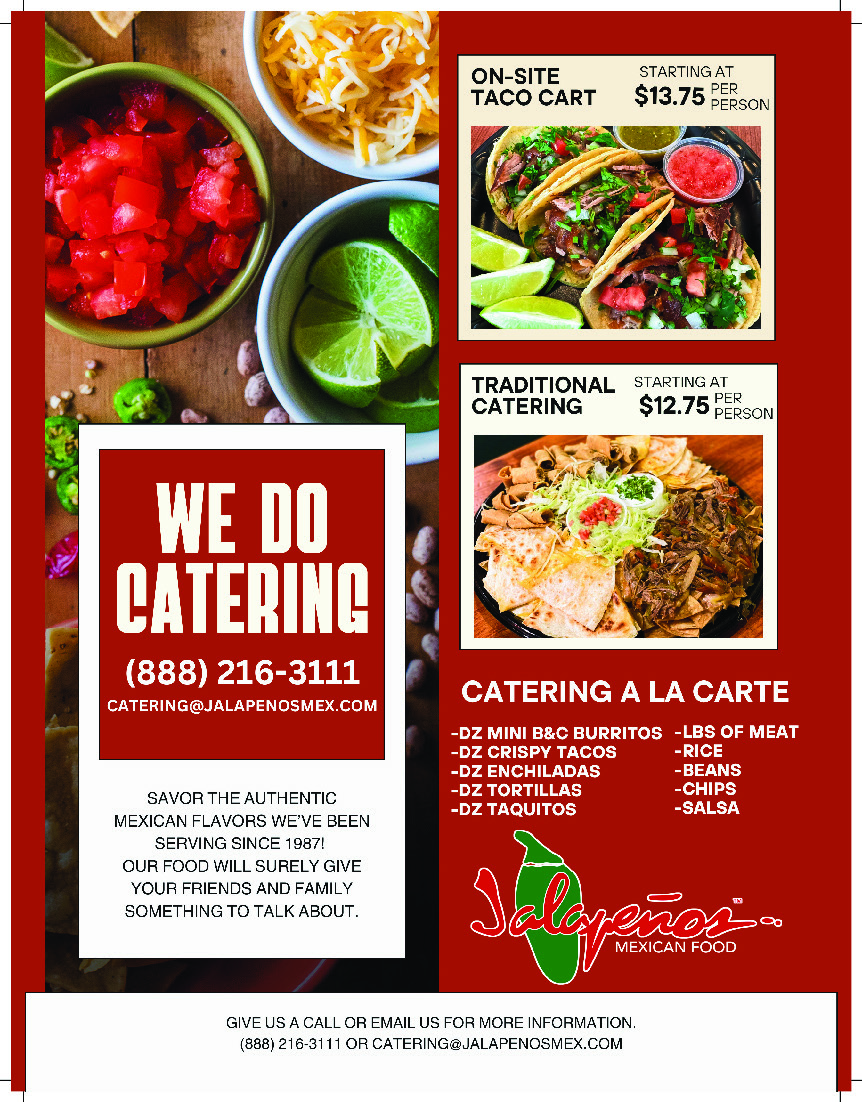 Jalapeños Mexican Food Tustin 450 E. 1st St Call for Reservations/Ordering (714) 544-8972 Ladera Ranch 27602 Anonio Pky Call for Reservations/Ordering (949) 364-5614 Yorba Linda 18539 Yorba Linda Blvd Call for Reservations/Ordering (714) 921-5272 Go to our Website Call for Catering: (888) 216-3111 ORDER JALAPENOS ONLINE Just show your coupon to your server and $AVE!