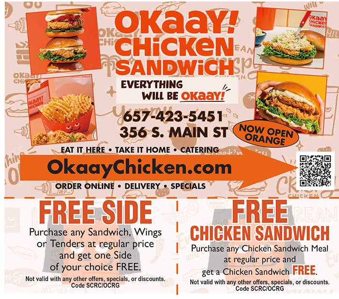 Okaay! Chicken Sandwich 356 S. Main St, Orange Call for Reservations/Ordering (657) 423-5451 Go to our Website ORDER OKAAY CHICKEN ONLINE Just show your coupon to your server and $AVE!